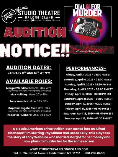Manes Studio Theatre will be hosting auditions for the play, Dial “M” for Murder, byFrederick Knott.Frederick Knott's riveting thriller had a highly successful run on Broadway and later gained popularity as a major motion picture directed by Alfred Hitchcock.